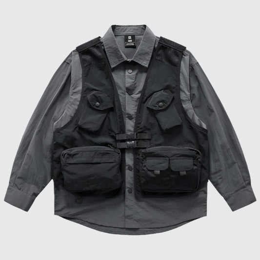 Multi-pocket Utility Vest Cargo Over Long Sleeve Shirt