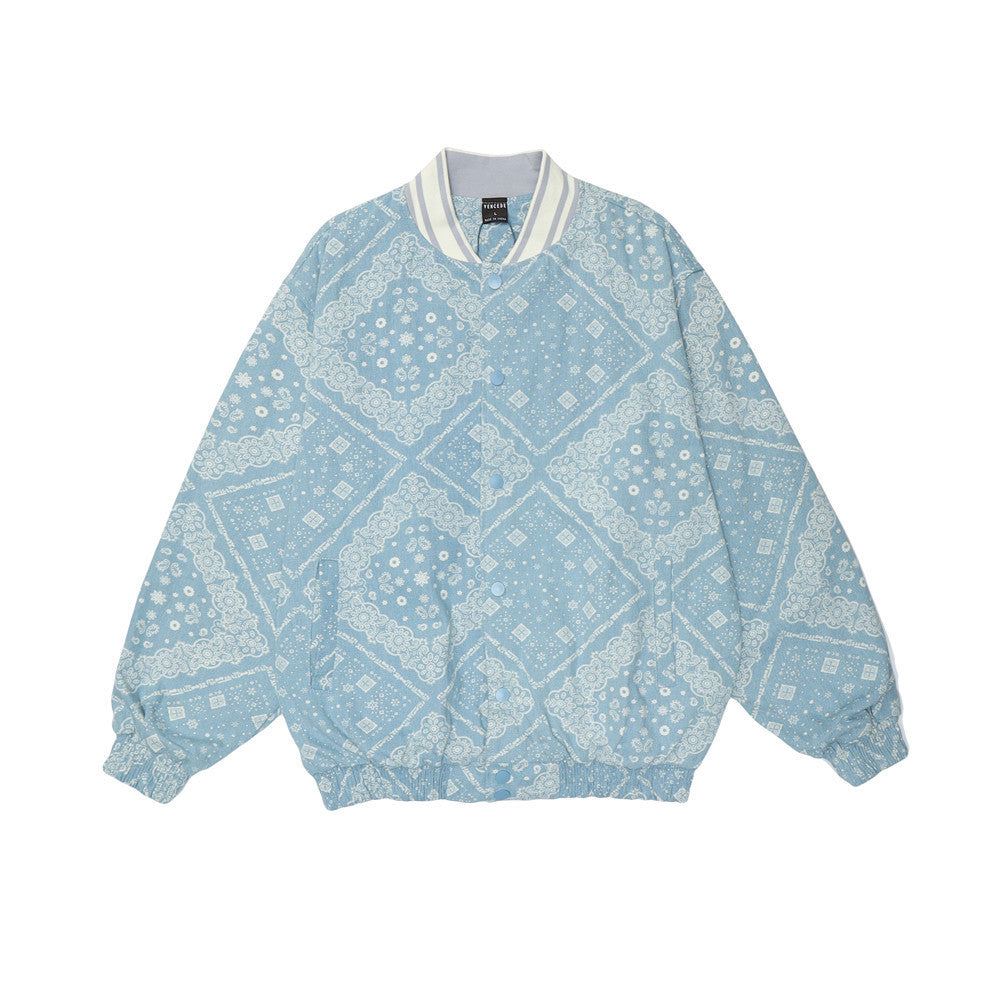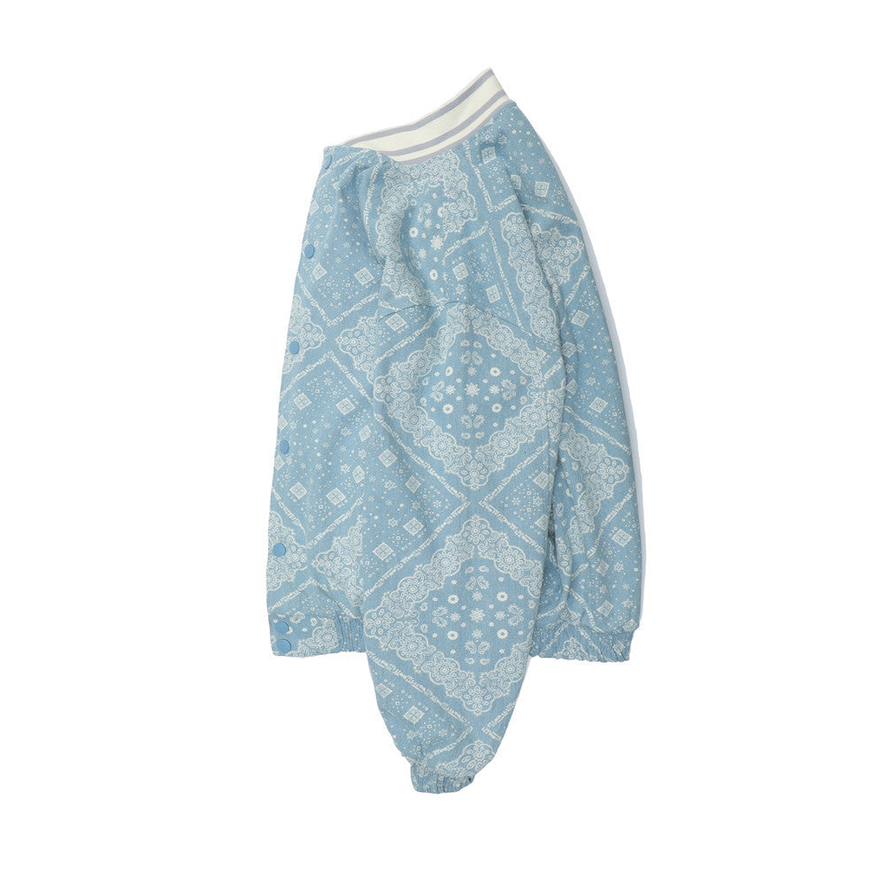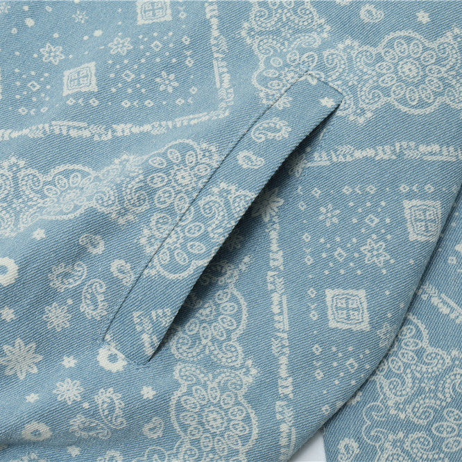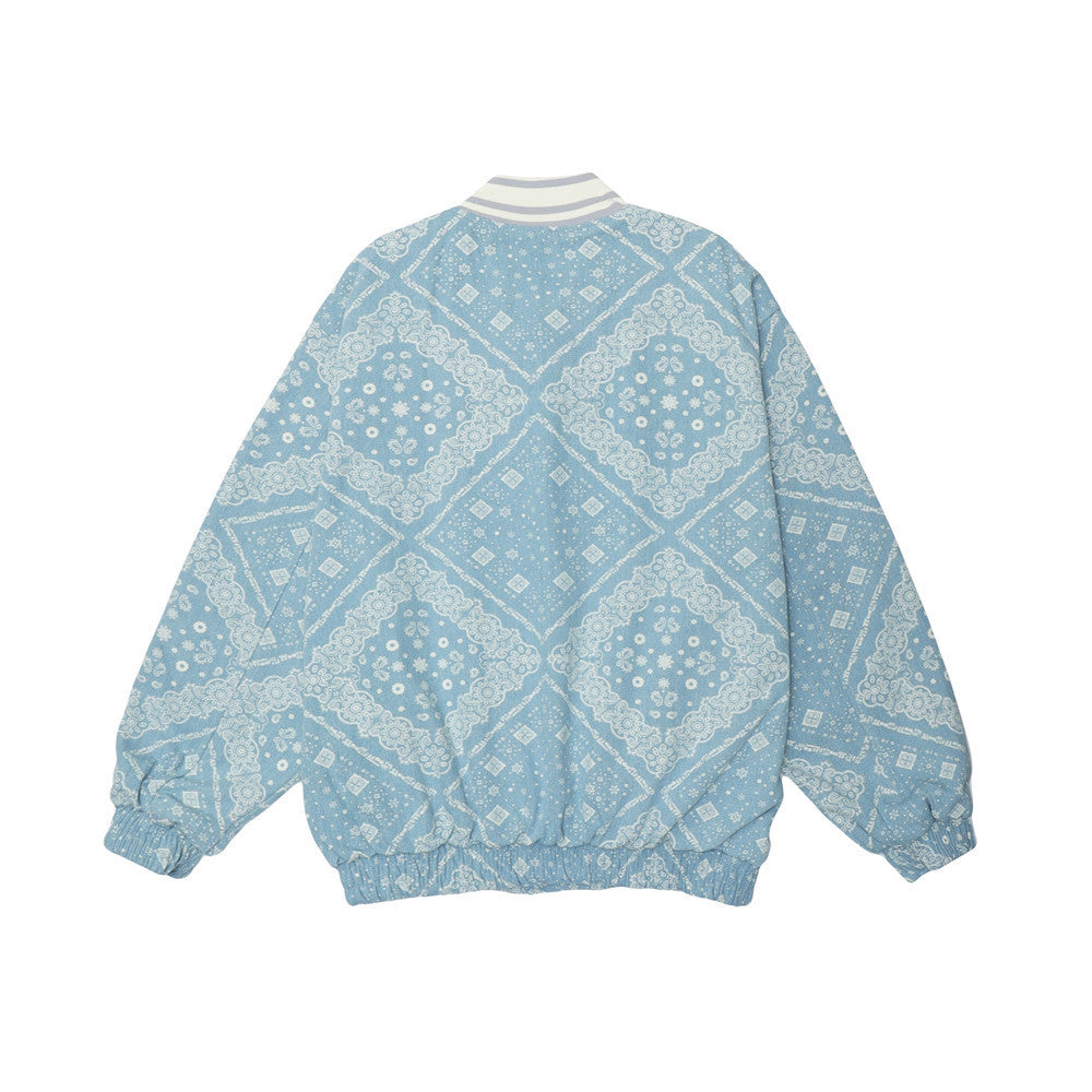 True to size with a relaxed bomber fit. Cut from mid-weight denim with an allover bandana print, this jacket features a striped rib collar, full-snap front, discreet side welt pockets, and an elasticized hem with cuffed sleeves for easy layering.