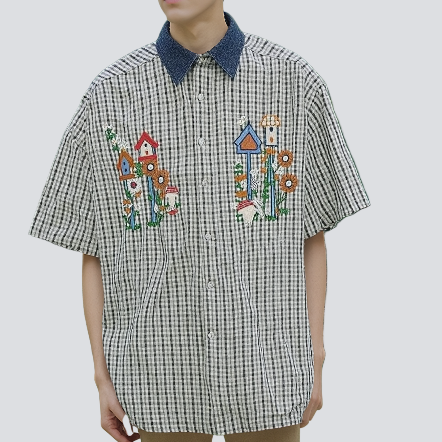 Cut with a relaxed fit in a breathable gingham woven, this playful shirt features a contrast denim collar, clean button-front placket, whimsical birdhouse & floral embroidery at the chest, and a straight hem for easy layering. Soft hand feel with enough structure to hold its boxy drape. Available in light khaki or coffee check.