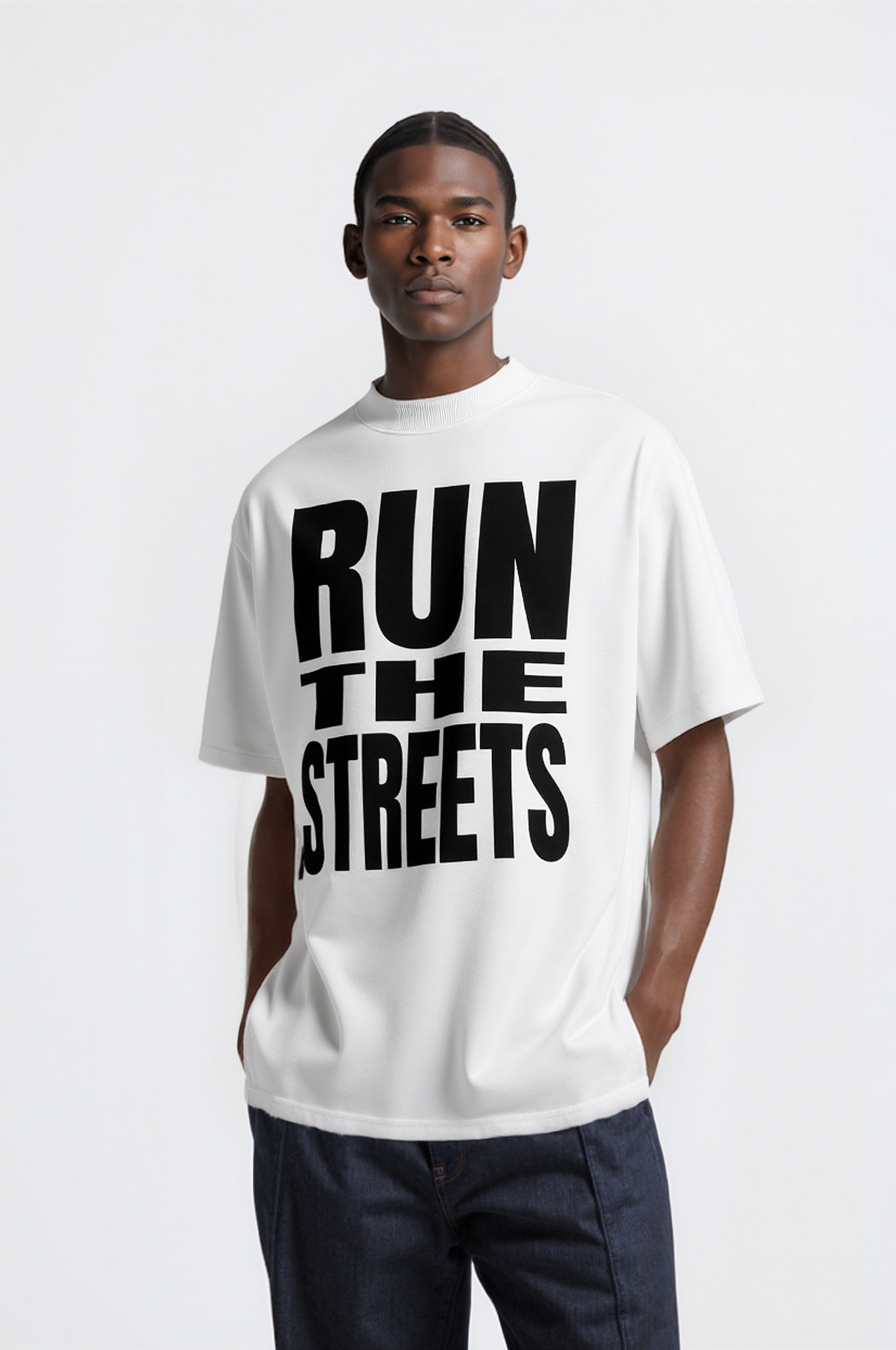 🔥 Fit Tip: Cuff the sleeves and layer over tapered joggers or a longline tee—let the “Run The Streets” motif command every scene. 🔥